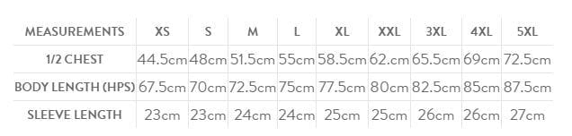 | 1/2 CHEST | 44.5cm | 48cm | 51.5cm | 55cm | 58.5cm | 62cm | 65.5cm | 69cm | 72.5cm |